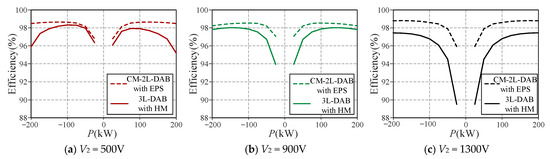 - The CM-2L-DAB is more efficient than the 3L-DAB in most operation points, since it employs semiconductor devices more effectively, i.e., series connection for high voltage and parallel connection for high current. Thus, the current stress of the CM-2L-DAB is considerably lower;