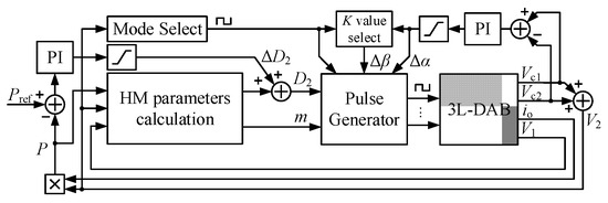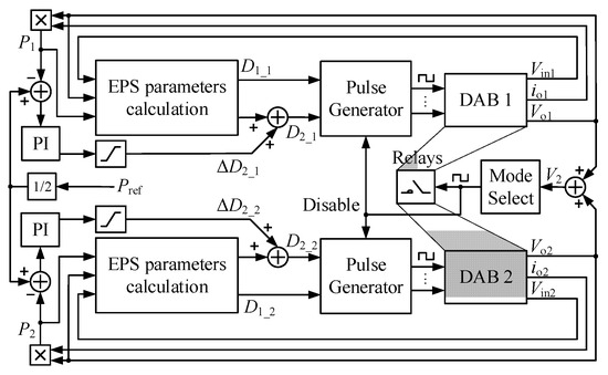 As shown in Figure 11, in the CM-2L-DAB, each submodule employs a closed-loop output power regulator with a reference to the equally shared power. It should be noticed that a feedforward control parameter calculation can be implemented based on the analytical solution of the EPS modulation. On top of the submodule-level control, a system-level mode selection module is implemented based on the output voltage to control the power relays.