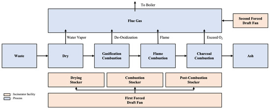 A study was conducted on an ICC system that automatically controls the airflow of a stoker incinerator using AI. Among the various types of incinerators, the research focused on the most widely operated stoker-type WtE facility. Of the representative operational variables of stoker incinerators—waste feed rate, airflow, and stoker speed—the study explored the method of automatically controlling airflow using AI, as it has the greatest impact on the combustion process. The waste combustion process in the stoker-type WtE facility targeted in this study is presented in Figure 1 and Figure 2.