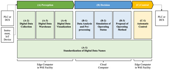 Therefore, AI to propose the optimal incinerator operating methods was studied. AI capable of simulating the operating status of the incinerator and exploring the optimal operating methods through trial and error was researched. To achieve this, studies were conducted on (B-1) data analysis and pre-processing, (B-2) simulation of operating status, and (B-3) proposal of operating methods. The validity of the study was evaluated based on the operational results of the incinerator determined by AI. The interaction and operational sequence of the perception–decision–control stages in the ICC system are presented in Figure 4.