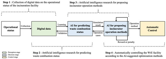 The ICC system was studied in three stages: perception, decision, and control. In the perception stage, the collection and visualization of digital data on the WtE facility’s operating status were researched. This enabled the AI to accurately understand the WtE facility’s operating status and make appropriate decisions. In the decision stage, the AI capable of making decisions based on the perceived data was researched. The AI determined the optimal incinerator operation method to enhance energy recovery and reduce pollutant emissions from the WtE facility. Finally, in the control stage, methods for automatically controlling the incinerator based on the AI-determined operation methods were studied. The architecture of the ICC system configured in these stages is presented in Figure 3.