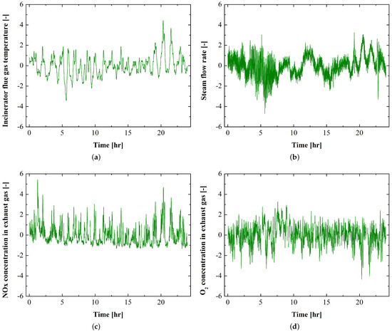 It was confirmed that the collected digital data were of high quality. The quality of the collected digital data was evaluated based on accuracy and timeliness. Data accuracy was assessed by comparing the measurement data received by the control system with the collected digital data for errors and data loss. When comparing the digital data collected over six months, from September 2023 to February 2024, for the representative state value of the incinerator flue gas temperature, no errors were found, and approximately 0.12% of the data was lost. The data loss rate was calculated as (1 − (actual number of collected digital data/number of digital data that should have been collected according to the data collection interval)). However, since the data loss was not continuous, it was determined that there were no issues with utilizing the data in the AI. Timeliness was evaluated by examining the time taken for the WtE facility’s operating status, received by the control system, to be collected as digital data. Analyzing the time differences among the measurement data received by the control system, the collection time of the operating status, the conversion time to digital data, the transmission time of the digital data, and the reception time of the digital data revealed no significant differences. The temporal changes in the representative WtE facility operating statuses collected as digital data, such as (a) incinerator flue gas temperature, (b) steam flow rate, (c) NOx concentration in exhaust gas, and (d) O2 concentration in exhaust gas, were standardized using Z-score normalization and presented in Figure 6. Z-score normalization is a technique used to standardize the values of a dataset to have a mean of zero and a standard deviation of one. The formula for Z-score normalization is given by