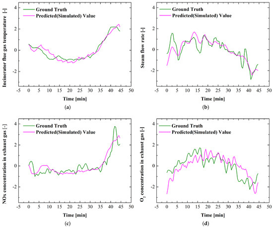 Comparison between AI-simulated operating status and actual values (ground truth) for 45 min of test set (Z-score normalization). (a) Incinerator flue gas temperature. (b) Steam flow rate. (c) NOx concentration in exhaust gas. (d) O2 concentration in exhaust gas.