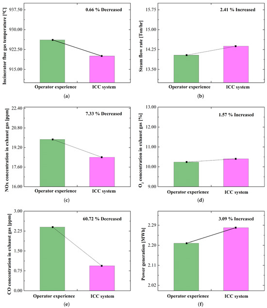 Experiments confirmed that the automatic control of the studied ICC system resulted in a 2.41% increase in steam flow rate and a 7.33% reduction in NOx emissions. In January 2024, a four-day experiment was conducted to evaluate the automatic control of the ICC system under the same conditions as the performance evaluation of AI combustion control. To address the issue of increased NOx emissions observed in previous experiments, the AI was updated to suggest the operating method at 5 min intervals, and the second FD and ID fans were automatically controlled to gradually transition from the current airflow rate to the AI-suggested airflow. The results, shown in Figure 9, indicate that the incinerator flue gas temperature decreased by 0.66%, steam flow rate increased by 2.41%, power generation increased by 3.09%, and CO emission concentration decreased by 60.72%. Additionally, unlike in the performance evaluation of AI combustion control, NOx emissions decreased by 7.33%. These results are similar to those found in previous studies conducted by incinerator manufacturers [19,20,21,22,23,24,25].