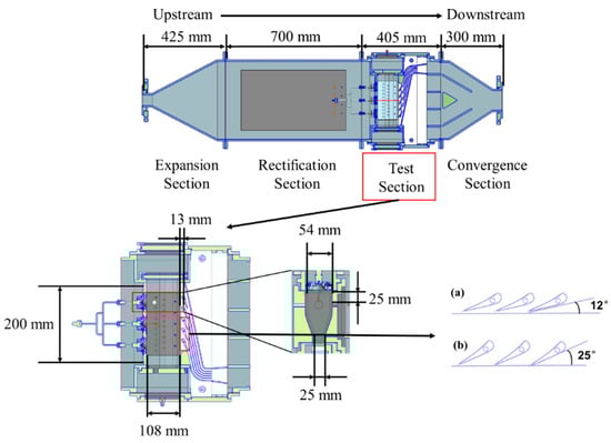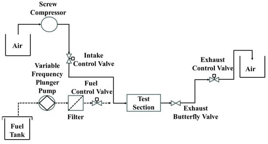 The experimental system in this paper is shown in Figure 1. Air was compressed by a screw compressor, dried, and then supplied to the combustor. The inlet air mass flow rate was regulated by an adjusting valve and mass flow meter in a range from 0.076 kg/s to 0.143 kg/s. The operating temperature and pressure were set to 300 K and 101.3 kPa, respectively, for all the examined cases. As shown in Figure 2, the air was delivered to an expansion section (425 mm), settled down in a rectification section (700 mm), and delivered to a turbine guide vane coupled with the triple-dome combustor test section (405 mm) and exhausted through a convergence section (300 mm). The fuel (RP-3) was delivered to the manifold by an oil pump at the same operating temperature as air with a mass flow rate range from 6.60 kg/h to 12.73 kg/h. Figure 2 also shows the dimensions of the triple-dome combustor section. The length of the triple-dome combustor section is 108 mm, and the total height is 200 mm, with the height of each dome being 67 mm, which also means that the space between adjacent nozzles is 67 mm. The widths of the combustor are 54 mm and 25 mm at the inlet and outlet of the chamber, respectively. The triple-dome combustor section is equipped with three centrifugal atomizing nozzles simultaneously supplied with fuel. The air was swirled by a dual-stage swirler with 19.5 mm and 48 mm for the first and second stage swirler diameters, respectively, for increasing fuel and air mixing and stabilizing the flame. Five turbine guide vanes were installed 13 mm downstream of the combustor to investigate the effect of turbine guide vanes on the ignition and light-round process of the triple-dome combustor. Details of the turbine guide vanes’ arrangement are shown in Figure 2a,b. The guide vane blockage ratio is designed between 0.6 and 0.8 (corresponding attack angles range from 25 degrees to 12 degrees), with intervals of 0.05; yields of 6 different turbine guide vane conditions are shown in Table 1. Sonic was not achieved in all the turbine guide vane conditions.
