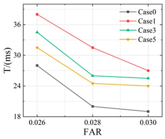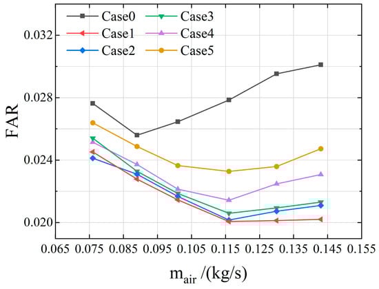 It can be found that, under the same inlet air mass flow rate, the ignitable fuel-to-air ratios for the cases with turbine guide vanes were consistently lower than that for the case without turbine guide vanes. For the case without turbine guide vanes, the minimum ignitable fuel-to-air ratios reached their lowest value (0.0257) at an air mass flow rate of 0.089 kg/s. Subsequently, as the air mass flow rate increased, the minimum ignitable fuel-to-air ratio for the case without turbine guide vanes gradually increased to 0.301. In the meantime, for the cases with turbine guide vanes, the minimum ignitable fuel-to-air ratio decreased significantly with the increment of the inlet air mass flow rate. When the air mass flow rate reached 0.116 kg/s, the minimum ignitable fuel-to-air ratio reached its minimum value for case 1 to case 5. As the inlet air mass flow rate continued to increase beyond this point, the minimum ignitable fuel-to-air ratio increased. However, for the highest block ratio case, the minimum ignitable fuel-to-air ratio remained nearly constant when the air mass flow rate increased.