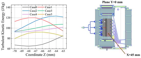 With the blockage ratio increased from 0.6 to 0.8, the minimum ignitable fuel-to-air ratio decreased by 15%; this suggests that the arrangement of the turbine guide vanes could influence the flow field in the combustor and then influence the minimum ignitable fuel-to-air ratio, which indicates that as the blockage ratio increases, the ignition characteristics of the combustion chamber are improved. In Figure 4, X = 45 mm is the location where the turbulent kinetic energy is highest on the Y = 0 mm plane. The igniter is located at Z = −66.5 mm during the ignition boundary experiment. It is found by collecting the data of turbulent kinetic energy at Z = −70 mm~−63 mm that as the blockage ratio increases, the turbulent kinetic energy gradually increases and is always higher than the scheme without guide vanes. This confirms the conclusion that increasing the blockage ratio can significantly enhance the minimum ignition boundary.