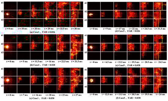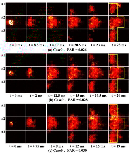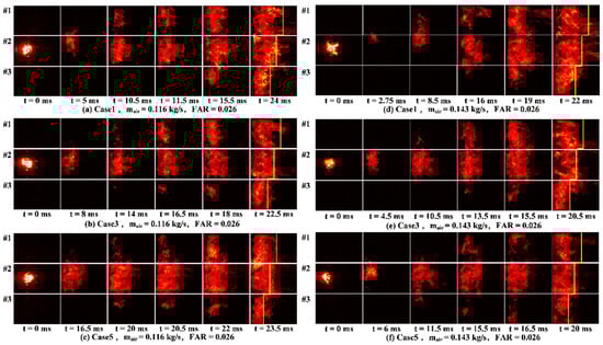Figure 7 shows the instantaneous flame propagation images during the light-round process of the triple-dome combustor with guide vanes of 0.8 and 0.6 blockage ratio under fuel-to-air ratios from 0.026 to 0.030. The light-round process of the schemes with guide vanes of 0.8 blockage ratio under all the examined FAR showed a sequence in which the middle #2 dome ignited the upper #1 dome first, followed by the ignition of the lower dome (#3) by the #2 dome. Although the #1 dome ignited later than the #2 dome, the flame in the #1 dome showed higher flame propagation speed, therefore overtaking the flame in the #2 dome in the later stage of the flame propagation. At the end of the light-round process, the length of flame propagation was in the order of #1, #2, and #3.