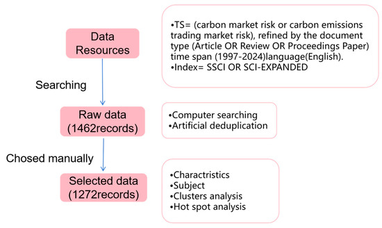 The textual data were obtained from the SCI and SCI–EXPANDED databases in the core database of Web of Science, and the types of literature selected were article, review, and proceeding papers. Because the Kyoto Protocol marked the birth of the international carbon trading model, the time of the adoption of the Kyoto Protocol in December 1997 was taken as the starting point, and the research period extended up to 31 March 2024. The keywords “carbon market risk” and “carbon emissions trading market risk” were used for screening. Finally, English was selected as the language. By removing duplicates and irrelevant articles, 1272 highly relevant articles were obtained, as shown in Figure 1.