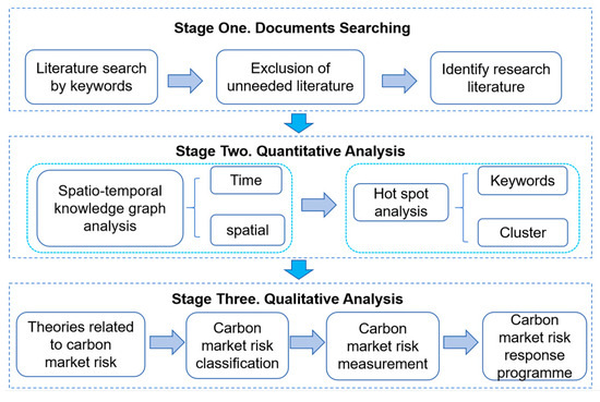 This paper provides an econometric analysis of the literature in the field of carbon market risk to visualize the current status, evolution, and thematic distribution of carbon market risk research. The main innovations are as follows: first, CiteSpace is used to clarify the evolution of carbon market risk research based on temporal, spatial, and knowledge mapping. This method not only overcomes the many problems associated with traditional literature reviews and ensures the scientific validity of the conclusions, but also provides a reference for subsequent carbon market risk research. Second, using keyword highlighting and cluster analysis, we explore the research areas of carbon market risk research, identifying current research hotspots and research gaps, with a view to helping scholars to quickly understand cutting-edge issues in carbon market risk and enabling them to carry out more innovative research.