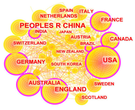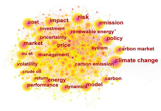 By exploring the regional distribution of carbon market risk research and the cooperation between countries, a map of national cooperation networks for carbon market risk research was generated, as shown in Figure 4. Figure 4 shows that the retrieved studies represent 89 countries or regions, and the overall density of the network is 0.1399, which represents a high level of inter-country cooperation. The node size shows the multi-polarization of the issuing regions, with China at the top of the list in terms of the number of articles issued (n = 391), followed by the US, England, Australia, and Germany, among others. According to the World Bank’s official website for 2020, the country with the highest carbon emissions is China, accounting for about 30 percent of the global total. China has pledged to achieve peak carbon dioxide emissions by 2030 and work towards carbon neutrality by 2060. In the face of the vast and urgent pressure to reduce emissions, Chinese scholars have been more active in researching the improvement of the carbon market and risk avoidance in their country, and they are at the top of the list in terms of the number of articles published. The shade of color of the outer ring of the node represents the degree of centrality. The UK has the highest centrality, with a centrality value of 0.19, followed by Australia, the USA, Malaysia, and Germany, among others. The centrality of these countries is shown by the fact that they play a “bridging” role in the study of carbon market risk. As a country that achieved industrialization earlier, the UK’s high energy consumption and pollution-intensive approach to economic growth has forced it to urgently seek a sustainable development path. The United Kingdom, in 2002, became the first country to implement a greenhouse gas trading mechanism. In 2008, the UK published the Climate Change Act, which proposed reducing greenhouse gas emissions by more than 80 percent from 1990 levels by 2050, well above the carbon reduction requirements set by the EU. Therefore, British scholars’ research on the carbon emissions trading market started earlier and they have published more papers, laying a strong foundation for other countries to study their carbon markets.