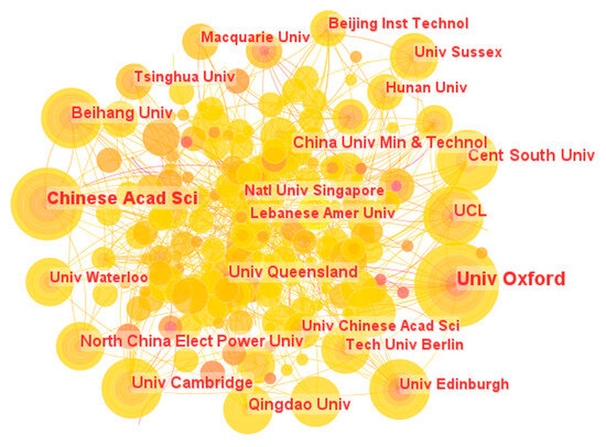 We then explored the institutional cooperation and distribution of carbon market risk and generated an institutional distribution cooperation network map, as shown in Figure 5. Figure 5 shows that a total of 619 institutions or organizations worldwide have published papers on carbon market risk. However, there needs to be more cooperation between institutional organizations, and the network density is only 0.005. The University of Oxford published the most articles (n = 26), followed by the University of the Chinese Academy of Sciences, Central South University, University College London, and Beijing University of Aeronautics and Astronautics, among others. However, the University of Edinburgh has the highest centrality, with a value of 0.12, followed by the University of Oxford, the University of the Chinese Academy of Sciences, and the University of Cambridge. These organizations play a crucial role in carbon market risk research.