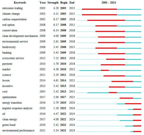 Highlighting analysis is used to analyze the latest research issues and changing trends in a particular research field. Keyword highlighting reflects the high-frequency keywords that appear at different stages in research hotspots and cutting-edge issues. In this study, CiteSpace was used to generate a mutation map of carbon market risk keywords from 2002 to 2024; Figure 6 shows the research hotspots of carbon market risk in different periods. The long colored bar in the figure represents the overall research year, the red part represents the part of the year in which the term is mutated, the light blue part indicates that the keyword had not yet begun to be researched in this period, and the dark blue part indicates that scholars have already started to research the term but it has not become a research hotspot; the degree of mutation refers to the frequency with which the keyword appears in a specific period of time. As shown in Figure 6, the carbon market risk research pathway is divided into two main phases, the first from 2002 to 2018 and the second from 2019 to 2024. In the first stage, the words with a prominence of 6 or more were ecosystem service (7.52), carbon sequestration (6.17), real option (6.17), and conservation (6.14). The four terms with the highest prominence in the first phase mainly fell into the categories of carbon market risk influencers and methods for analyzing the value of carbon sinks.