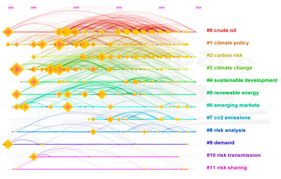 The timeline view of the clusters shows that cluster #0, crude oil, has been the focus of research on spillover effects, carbon markets, carbon prices, and EU equivalence standards. As more in-depth studies of the carbon market financial market have been conducted, the research hotspot has shifted from exploring the impact of climate on carbon market risk to examining the risk spillover effects between the carbon market, the energy market, and the stock market, as well as exploring investment risks affecting carbon sink projects. As such, #1, climate policy, #3, climate change, #6, emerging markets, #9, demand, #10, risk transmission, and #11, risk sharing, have had less attention over the last decade. Studies related to #2, carbon risk, have examined the impact of carbon risk on share price returns, financing costs, and corporate decision-making, but no scholars have explored the impact of carbon risk on information efficiency. Analyzing the previous literature shows the possibility that carbon risk affects the information content of stock prices. In order to mitigate the negative impacts of carbon risk on firms, surplus management, disclosure, and other behaviors adopted by firms change the firm’s information environment, which, in turn, affects the extent to which firm-specific information enters the stock price. There are no studies that consider stock price information content as an economic consequence of carbon risk. Therefore, carbon risk has remained a hot research topic in recent years. Topic #4, sustainable development, was a research hotspot between 2002 and 2005 as a result of the World Summit on Sustainable Development in 2002, which discussed the implementation of sustainable development and set new goals and commitments to promote further global efforts on sustainable development. Scholars have begun to focus on the sustainable development paths of carbon-emission-related businesses, as well as on the sustainable development paths of regional economies, in light of the implementation of carbon-emission policies.