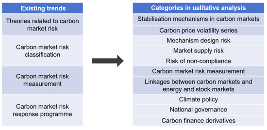 Based on the above research trends, we can summarize and discuss the development of carbon market risk from a macro perspective in relation to four areas: carbon-market-risk-related theories, carbon market risk classification, carbon market risk measurement, and carbon market risk response options. The reasons for choosing the above four aspects for further discussion are as follows: first, the study of carbon market risk requires an understanding of the relevant theories of carbon market risk, in order to lay a foundation for subsequent research. Second, compared with the general financial market, the carbon financial market is highly susceptible to the influence of policies, macroeconomics, energy markets, and climate conditions. Fluctuations in the carbon price will not only significantly impact the returns of emission-control enterprises and investors but will also affect the realization of emissions reduction targets. Therefore, correctly measuring risk in the carbon market has definitive practical significance for market participants. Finally, the carbon market is also subject to enormous risks, which are not only affected by the macroeconomic situation and market mechanism but are also closely related to the external environment, such as national quota allocation, energy prices, and policies. These risk factors are characterized by diversity and variability. Therefore, it is of great practical significance for the sustainable and healthy development of the carbon market to measure the value of carbon market risk and take the necessary risk management measures. Each aspect is then discussed in the context of carbon market risk clustering mapping and clustering labels from different perspectives, as shown in Figure 8.