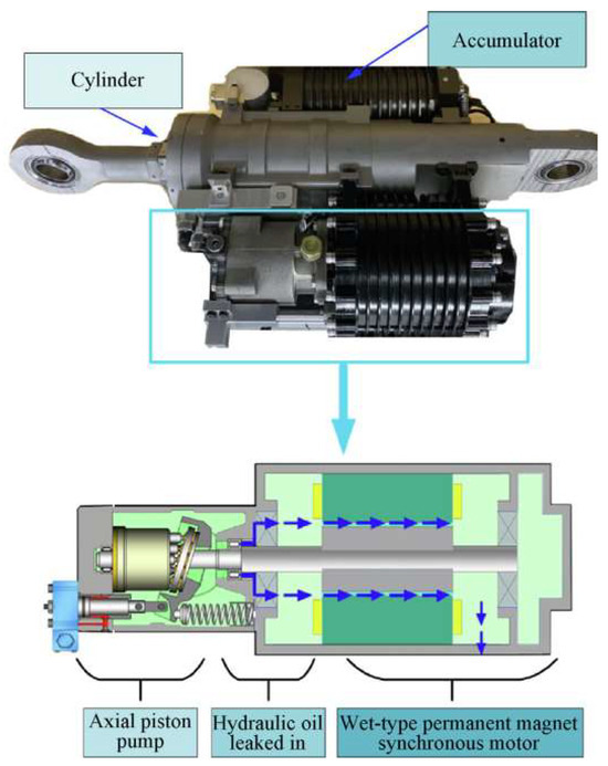 Integrated EHA (In the blue box at the top of the figure is the EHA) with wet-type permanent magnet synchronous motor (WPMSM). [16].