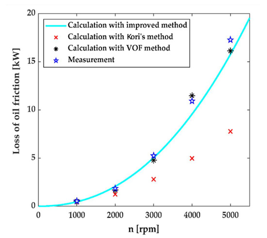 Reference [48] used an improved analytical method and a Volume of Fluid (VOF) model to calculate the viscous loss of an oil-immersed cooling in-wheel motor. By comparing the results from Kori’s method with a three-dimensional transient CFD model based on the VOF, as well as actual measurements, as shown in Figure 4, they found that the VOF model was more precise but more time-consuming, and that oil viscous loss is proportional to the 2nd–3rd power of the rotational speed.
