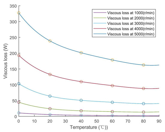 In reference [51], the authors investigated the effect of rotational speed on viscous loss and focused on the relationship between viscous loss and temperature. In the CFD model, the viscosity of the oil was altered to obtain different viscous losses, and then the relationship between these viscous losses and temperature was fitted using (16). Figure 7 shows the change in viscous loss with temperature.