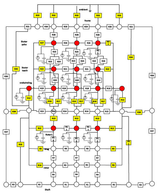 In the field of oil-filled aircraft motor system design and analysis, Johansson Björn [56] proposed a thermal network model for aircraft electric–hydraulic actuation systems that includes motors, hydraulic pumps, and power electronics. The motor in the model uses a simplified approach, considering only eddy current losses, copper losses, and windage losses, which may not fully reflect actual motor conditions, especially under different cooling conditions and temperature rises. Reference [57] established an eight-node lumped-parameter thermal model for Brushless DC Motors (BLDCs) with internal oil filling in Electro-Hydrostatic Actuators (EHAs), as shown in the figure. This model enables temperature rise analysis under various operating conditions but does not detail the acquisition of thermal parameters nor validate results with experimental data. The thermal parameters in the thermal network include empirical formulas for heat transfer coefficients, heat capacity, and thermal conductivity. Regarding heat transfer coefficients, P.-O. Gronwald [58] summarized empirical formulas for heat transfer coefficients at various parts of the motor. It was observed that different motor structures exhibit significant differences in their empirical heat transfer formulas, and there is limited research applicable to OFMs, making it challenging to obtain suitable empirical formulas for heat transfer coefficients. C. Sciascera [59] conducted research on heat capacity and thermal conductivity coefficients. In their study, an LPTN was implemented to model heat flow within a permanent magnet synchronous motor (PMSM). Due to the motor’s low rated speed, both mechanical and iron losses were neglected. They proposed a method to calibrate thermal parameters based on experimental data, using Sequential Quadratic Programming (SQP) algorithms to adjust thermal resistance correction coefficients. Reference [51] combined CFD and LPTN methods. The convective and conductive heat transfer coefficients obtained from a CFD-modified model were incorporated into a thermal network model, as shown in Figure 8, to achieve a more accurate temperature field model. In this case, yellow blocks represent thermal resistance including convective thermal resistance and conduction thermal resistance, white blocks represent thermal resistance including conduction thermal resistance, red circles mean nodes with heat source, and white circles mean nodes without heat source.