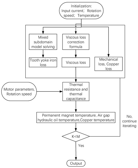 Reference [31] used experimental data to correct the model parameters of viscous loss, ensuring the accuracy of the viscous loss calculation formula at high speeds, while also considering the relationship between viscosity and temperature. This semi-analytical formula, based on experimental data, can describe the viscous loss of this specific motor structure well, but the complex experimental process makes its application unfriendly, and its applicability to other motors cannot be guaranteed. The proportion coefficient f, the fluid dynamic viscosity μ, the motor speed n, and the constant k related to the motor’s structural parameters are used in the following expression: