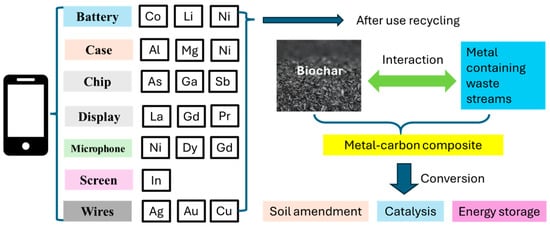 Biochar (BC) refers to the carbon-rich material produced from the thermochemical conversion technologies of biomass (i.e., pyrolysis, gasification, and conventional and microwave-assisted hydrothermal processes) and has gained significant attention as a versatile adsorbent for environmental applications [6,7]. The pyrolysis process, which involves the thermal decomposition of biomass in an oxygen-limited environment, transforms organic materials into BC with a high surface area and porous structure [8]. BC’s surface is abundant with functional groups such as hydroxyl, carboxyl, and phenolic groups, which facilitate the adsorption of metal ions [9]. Together, these properties, high thermal stability, and biocompatibility make BC an excellent candidate for environmentally friendly metal adsorption applications. BC can be engineered after production to enhance its adsorption capacity through various modification techniques. These modifications include physical activation (e.g., steam or CO2 activation) and chemical treatments (e.g., acid or base treatments) that increase the surface area, porosity, and functional group density of BC [10,11,12]. Despite its potential and the tremendous progress being made to evaluate different BC for various metal adsorption, the current understanding of BC’s metal adsorption mechanisms and optimization strategies for different metals remains incomplete and is updating very rapidly. Also, to the best of our knowledge of the recycling and regeneration of metal-loaded BC, emphasizing desorption and thermochemical recycling techniques are not previously reported in a summarized manner. Therefore, this review aims to fill these knowledge gaps by providing a comprehensive analysis of the recent advancements in engineered BC for metal adsorption.