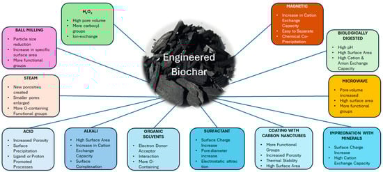 Biochar is valued for its large specific surface area, highly developed porous structure, and diverse functional groups, including carboxylic, carbonyl, ester, hydroxyl, phenolic, pyridine-N, pyrrole-N, and quaternary-N, which contribute to its efficacy as an adsorbent. Recent research shows that modified BC has a higher adsorption capacity than unmodified BC, driving interest in developing high-performance BC materials through various modification techniques [17,46]. Engineered BC is a biochar that has been deliberately modified through physical, chemical, or biological processes to improve its properties for targeted applications, such as adsorption or soil enhancement. These modifications typically enhance key characteristics like porosity, pH, cation exchange capacity, and specific surface area, leading to superior heavy metal adsorption capabilities compared to untreated BC [27,46]. Kumar et al. [21] reviewed modified agrowaste BC materials, which showed a wide range of adsorption capacities and achieved over 99% removal of toxic heavy metals from aquatic systems. Figure 2 illustrates various modification techniques and their effects on the properties of the engineered BC.