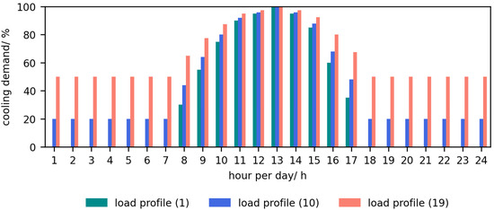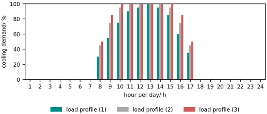 Specifically, based on a cooling-load profile that has no base load and runs for an operating time of 10 h per day—from 8 a.m. to 5 p.m.—and has a full load for 1 h per day, further load profiles are generated. These are generated by adding a base-load level of 20% and 50% each. On this basis, the peak values are each varied with a duration of 4 and 6 h. To identify the impact of the operating time, the 0 h are extended to an operating-load duration of 17 h—from 4 a.m. to 8 p.m.—on the one hand and to 21 h per day—from 2 a.m. to 10 p.m.—on the other. This results in a total of 27 load profiles, which are examined regarding flexibility. Table 2 gives an overview of the described load profiles.