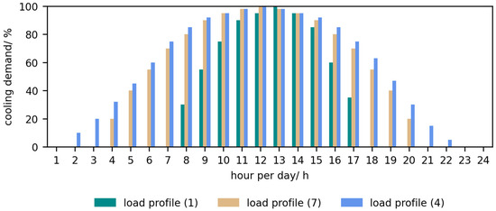 Thus, the cooling-demand profile of an application can be qualitatively characterised by the duration of the operating load and full load. The operating load refers to the load that exists during a specific period of normal operation of a system and can vary. The duration of the operating load corresponds to the period in which another load occurs in addition to the base-load level, which is the constant and continuous load that a system must always provide. In this research, this corresponds to the period in which air conditioning is required, for example. The full load represents the maximum load that the system must handle. The duration of the full load refers to the period during which the system must maintain this maximum load to meet the current cooling demand. Furthermore, the level of the cooling load plays an essential role, which significantly impacts the shape of the profile. Some applications have a continuous demand for cooling, resulting in a base load that can be considered as an additional parameter. The base load remains relatively stable and forms the base load that exists to meet the minimum requirements, regardless of fluctuating demands. This can be considered as a further parameter.