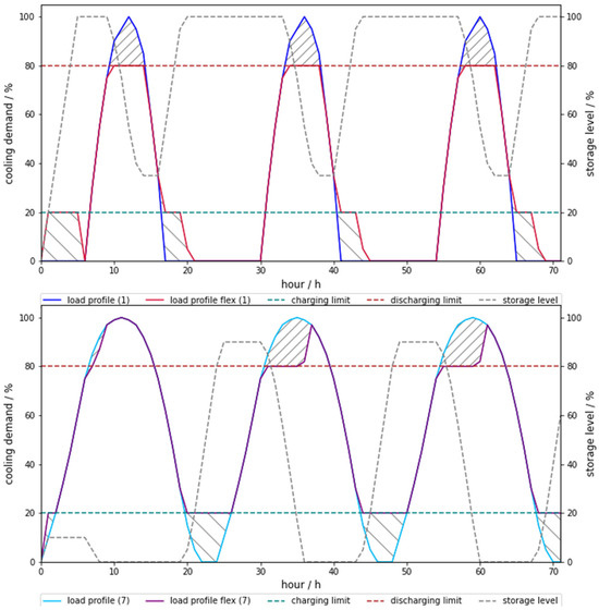 Figure 4 and Figure 5 illustrate two load profiles each, demonstrating the applicability of the selected storage limits to the specific load profiles. Figure 4 depicts load profile (1) in the first diagram and load profile (7) in the second diagram. The shaded areas represent the shifted quantities of energy that can be shifted by the storage system in accordance with its design specifications. The boundaries of these areas are indicated by the respective reference profile and the flexibilised load profile, which is a consequence of the operational mode of the cooling system used in conjunction with the storage tank. The flexibilised load profile is indicated in red and purple. In this example, a storage system with 100% storage capacity and 20% storage performance is considered. It is evident that in load profile (7), the peak load on the first day cannot be covered by the storage system, as it was initially empty and therefore requires a period of initial filling before it can be fully operational. From the second day onwards, the stabilisation of operations is facilitated by the storage system. This emphasises the importance of selecting the appropriate storage system dimensioning, as the peak load cannot be fully covered due to the insufficient capacity of the storage system.