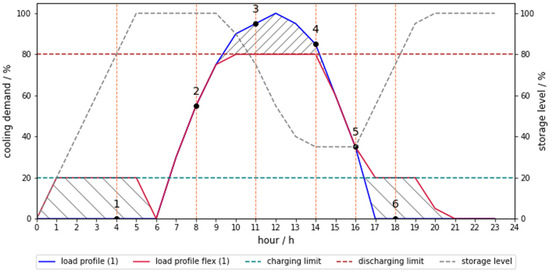 The simulation of the storage level depends on the selected storage dimensioning. An example is given that involves a storage with a storage performance of 20% and a capacity of 100%. In each scenario, it is assumed that the storage is empty at the beginning. Figure 6 shows the simulation of the quantity of energy that can be shifted due to the flexible load resulting from operation with the integrated storage system, using load profile (1) as an example, which has a charging limit of 20% and, as defined in Section 3.2, a discharging limit of 80%. Table 3 gives an overview of the storage level that results for the plotted points 1 to 6 when the storage is in operation at the specified limits.