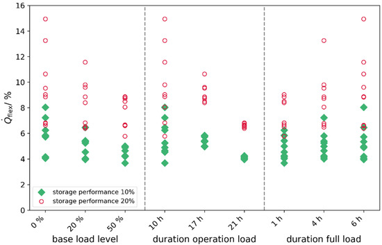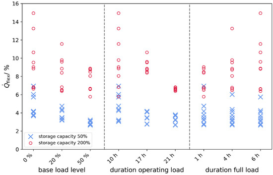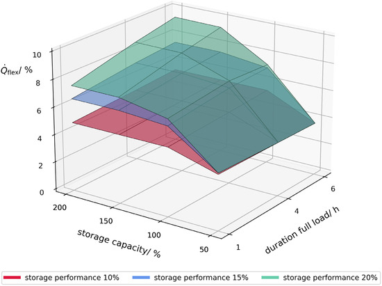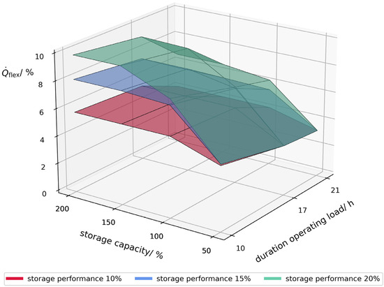 The aim is to investigate the impact of the load profile on the theoretically achievable flexibility. Figure 7, Figure 8 and Figure 9 each show the flexibility depending on the base-load level, the duration of the operating load, and the duration of the full load with various storage capacities.