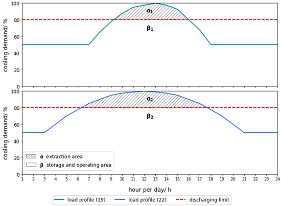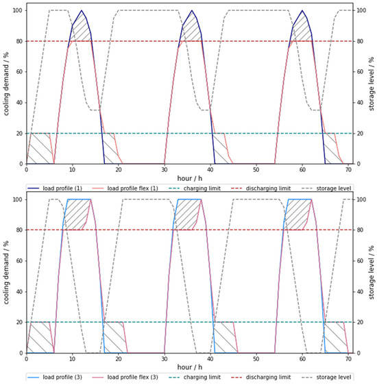 In relation to Figure 9, the impact of the variability in the characteristics of the duration of full load is demonstrated in Figure 10. The first diagram in the figure depicts load profile (1) in dark blue, while the second diagram presents load profile (3) in light blue. Load profile (3) is distinguished by a longer duration of full load in comparison to load profile (1), with the remaining characteristics, such as the absence of a base load and the duration of operational load, remaining unaltered. Furthermore, the storage dimensioning is also identical, with a storage capacity of 100% and a storage performance of 20%. The shaded areas in the figures represent the quantity of energy that can be shifted from peak load to off-peak times. This energy is highlighted by the reference load profile and the flexible-load profile, which is established when the operating mode of the storage systems is considered and the chiller is operated accordingly.
