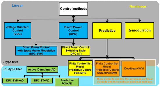 Selected methods used to control voltage converters can be classified in two ways. The first way divides the methods into those easily implementable for control systems of converters coupled with the power grid using an L-type filter and those that enable control of converters coupled with the power grid using an LCL filter. The second classification distinguishes between linear methods, marked with blue block backgrounds in Figure 1, and nonlinear methods, indicated by yellow backgrounds.