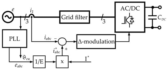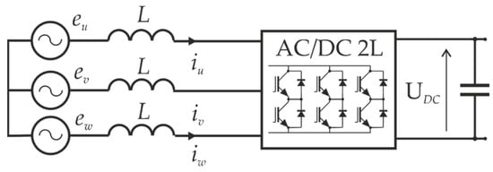 The schematic of an AC/DC converter with a passive L-type grid filter.