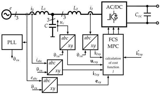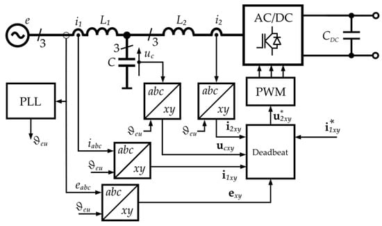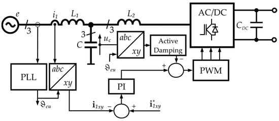 In the discussed control systems, significant inductance values must be used in an L-type filter for adequate filtering, especially compared to an LCL filter with the same total inductance, which offers higher suppression efficiency of higher harmonics. Furthermore, using LCL filters reduces the filter components’ size and cost. An LCL filter circuit contains two resonant circuits. To achieve high-quality regulation, appropriate resonant frequency values must be ensured during the filter design stage, preventing the amplification of harmonics generated by the AC/DC converter. For this reason, nonlinear control methods with variable switching frequencies are more challenging to implement in a converter system with an LCL filter. Linear controllers in linear methods exhibit good regulation effectiveness with steady or slowly varying signals, i.e., at frequencies significantly lower than the grid voltage frequency. In contrast, the resonant frequencies associated with the resonant circuits of the LCL input filter are rapidly varying signals in the rotating reference frame. Such signals significantly degrade regulation effectiveness in systems with linear controllers. The literature describes developing DPC and VOC methods using active damping (AD) strategies [19,20,21]. This strategy involves damping current components to the control signals to suppress resonant harmonics associated with an LCL filter (Figure 6). The effectiveness of using AD strategies significantly decreases with distorted grid voltage, requiring more complex methods [22]. Predictive algorithms are accessible from this drawback.