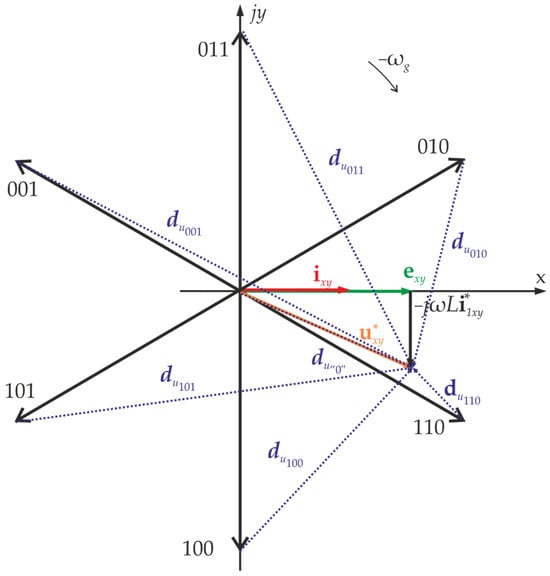 The task of the current control algorithm is to maintain the grid current ixy with the slightest possible deviation from the reference value. Hence, it can be assumed that the control error is defined as i*xy − ixy equals 0. Equation (3) in a steady state can be visualised, as shown in Figure 11.