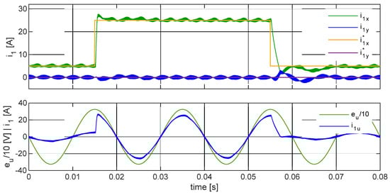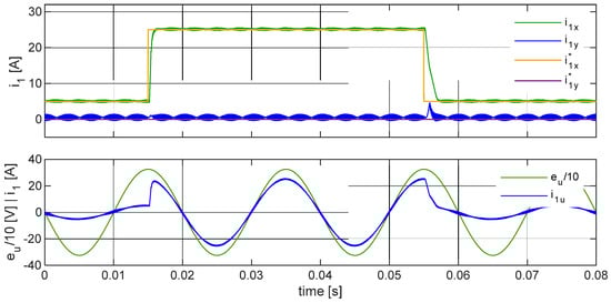 As can be observed, the increase in the x component of the grid current vector occurs at a completely different rate compared to the decrease of the same component. The longer the vectors di, the faster the controlled current changes. Vectors di101 and di001 or di‘0’ should be used to increase the x-component value of the grid. Conversely, to decrease the x-component value of the grid current vector, vectors di110 or di010 should be used. It is important to emphasise that increasing only the x component is impossible in the situation depicted in Figure 13. Applying any converter voltage vector changes the x and y components of the controlled grid current vector. The above information is confirmed by the results of simulation studies where the example of the predictive control method was compared with the example of the linear control method.