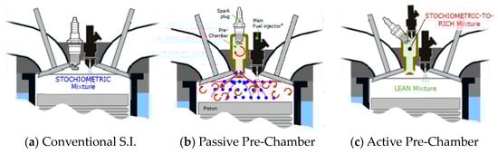 This ignition strategy can be implemented in two main ways: active [25,26] (or scavenged) and passive (or unscavenged) systems [27,28,29]. Figure 1 schematically compares the operating principles of active and passive pre-chambers with those of a conventional SI engine.