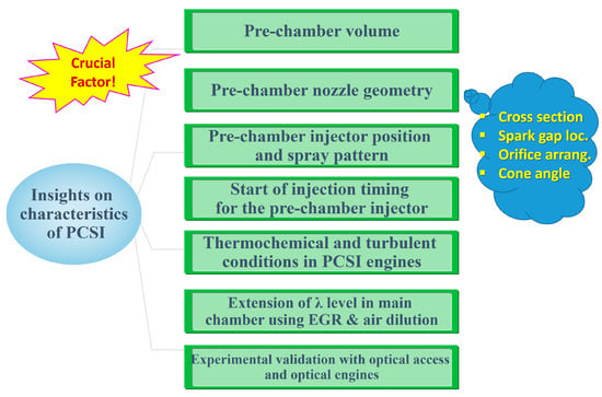 Since the early 2000s, research on PCSI using CFD simulation has primarily focused on optimizing the geometric configuration of the pre-chamber, including the nozzle diameter and number, orifice length, shape, and volume. Recently, these research themes have continued with the application of upgraded and more accurate numerical models. Figure 2 schematically illustrates these research topics utilizing CFDs. The research topics using CFDs can be summarized into two categories.