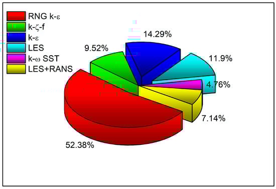 As shown in Figure 4, in the analysis of 52 publications reviewed, 52.8% of studies relied solely on the RNG k-ε turbulence model [103,104,105,106], while 11.91% of studies opted for LES alone. Moreover, 7.14% of studies integrated both LES and RANS models in their research. Common RANS turbulence models cited were standard k-ε, renormalization group (RNG) k-ε, and shear stress transport (SST) k-ω [106,107]. Sub-grid scale models for LES included Smagorinsky [107,108] only.