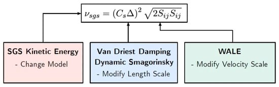 The most crucial noteworthy point is that the accuracy of LES heavily relies on the Sub-grid Scale (SGS) models used to represent the unresolved scales. This is because the computational grid limits the size of eddies that can be physically expressed. Despite their presence in the flow field, these eddies cannot be resolved because the CFD mesh lacks the resolution to capture and depict them accurately in CFD simulations. We are mainly concerned with the eddies larger than the mesh size in LES. These eddies are too large to be broken down by molecular viscosity; therefore, we need to find a way to model and remove these eddies from the grid. The turbulent kinetic energy predicted in our LES will be too high if we do not. These eddies are removed by applying an additional stress term to the Navier–Stokes equations, known as the sub-grid scale (SGS) stress. While various SGS models such as the Smagorinsky model [107], dynamic Smagorinsky model [71,72], WALE model [119], and others are available, none are universally applicable to all types of flows, leading to potential inaccuracies in specific scenarios. Different SGS models provide various methods for calculating the sub-grid kinematic viscosity, . The sub-grid kinematic viscosity is calculated using Equation (1) provided below: