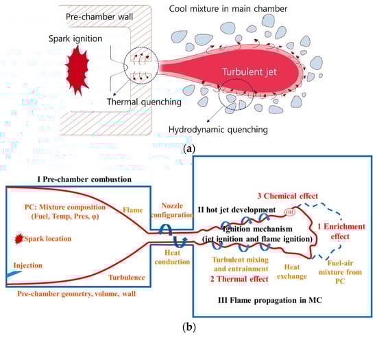 Schematic diagram of (a) quenching and (b) overview of turbulent jet ignition process [44].