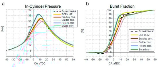 The laminar flame speed, SL, depends upon the local pressure, the fresh gas temperature, the local unburned fuel/air equivalence ratio using the Metghalchi and Keck correlation [95,96], and the chemical time arising due to the flame stretching [72,136,138,139,140]. These common correlations for SL are equations derived from fitting forms based on combustion experiments conducted over various temperature and pressure ranges. Therefore, outside the range of these correlations, the SL is calculated using extrapolation methods, which inherently introduce relevant input errors into any combustion model.