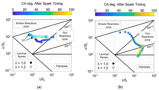 Within the context of the G-equation, several correlations for turbulent burning velocity from the literature [4,72] have been presented and evaluated in previous studies [138]. Among the most popular is Peters’s correlation [139], shown in Equation (2), valid for both large-scale and small-scale turbulence.