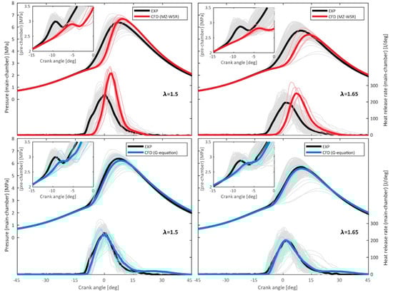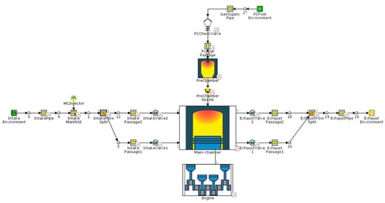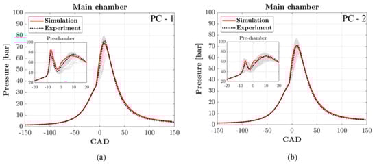 Silva et al. [47] developed a CFDs model based on the Reynolds-Averaged Navier–Stokes (RANS) approach for a methane-fueled engine, incorporating a well-stirred reactor combustion model [30,31] along with a detailed methane oxidation mechanism. They investigated the effects of various geometric parameters of the passive pre-chamber, such as the throat diameter, nozzle length, and nozzle diameter, on the overall combustion characteristics. Model validation was performed by comparing pressure profiles in both the main chamber and pre-chamber under motoring conditions at 1200 rpm. The findings revealed that the throat diameter plays a crucial role in influencing pressure accumulation and residence time within the pre-chamber, while the nozzle diameter impacts both the peak pressure and residence time.