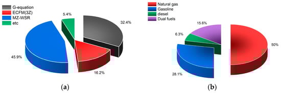 I reviewed various CFD software used for modeling the PCSI engines and the RCEM, as shown in Figure 3. Out of 61 studies [1,11,12,13,16,29,32,33,38,47,48,51,52,53,54,55,56,58,59,60,61,62,63,64,65,66,67,68,69,70,71,72,73,74,75,76,77,78,79,80,81,82,83,84,85,86,87,88,89,90,91,92,93,94,95,96,97,98,99,100], one did not specify the CFD software employed by the researchers. Most of the remaining articles used the commercial software CONVERGE™ [70] for simulations. Other programs like STAR-CD™ [71], FIRE™ [72], and VECTICS [73] were used much less frequently. CFD codes that appeared in only one study were grouped into an ‘Others’ category, which includes two programs such as KIVA-V3 [74]. Some studies used open-source software and custom-built codes; three used OpenFOAM [75].