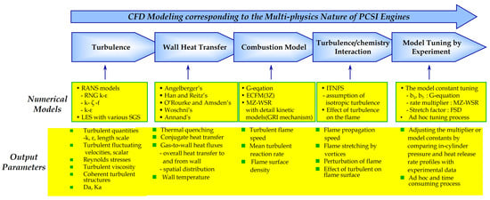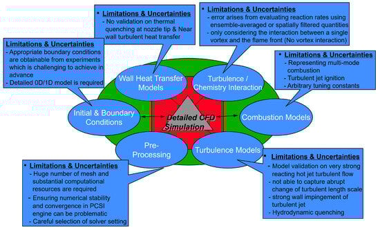 The selection of CFD software is primarily influenced by its capabilities, accessibility, and user preferences. Typically updated annually with enhanced features, commercial programs are adept at handling a broad spectrum of simulation tasks, as illustrated in Figure 3. Their user-friendly interfaces further improve their popularity by simplifying the simulation workflow. However, the substantial cost of licenses and limited customization options have driven some users towards open-source alternatives or the development of custom CFD codes. While utilizing these software tools has enhanced the accessibility of CFDs across more comprehensive users, it is imperative to acknowledge that mere accessibility is insufficient in addressing the challenges outlined in PCSI engines, as detailed earlier. The following sections discuss four critical focal points investigated to overcome these challenges. These include the distinctive features and comparative analysis of LES and Reynolds-averaged Navier–Stokes (RANS) models, the establishment of appropriate inflow and outflow boundary conditions, multi-mode combustion models, wall heat transfer, turbulence–chemistry interaction, rigorous verification and validation processes, and development of best practice guidelines in the field.