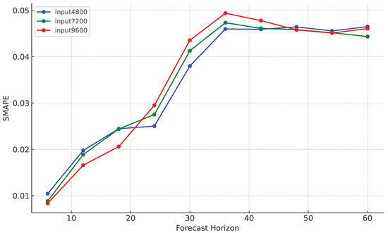 To better understand the performance of the proposed bidirectional fine-tuning model, we analyze its accuracy for different input and output ranges. Figure 3 illustrates the model’s performance, in term of SMAPE, for three different input lengths (4800, 7200, and 9600) across various forecast horizons. The mean SMAPE is calculated over the five regional time series, which is similar to the last row of Table 4. The results indicate that the performance of the model generally worsens (SMAPE increases) as the forecast horizon increases for all input lengths. This is not a surprising observation. It is a typical behavior in time-series forecasting, as the longer the forecast horizon, the greater the uncertainty and the higher the likelihood of prediction errors. In general, the farther into the future the model tries to predict, the less accurate the forecasts become, leading to an increase in SMAPE. The increase in error over time is expected due to the accumulation of forecast inaccuracies as the model moves further from the observed data. Thus, the observed trend is consistent with the inherent challenges of long-term forecasting. We also find that shorter input lengths (input4800 and input7200) generally yield lower SMAPE values in shorter forecast horizons, suggesting better accuracy in the short term. However, as the forecast horizon increases, the performance differences between input lengths become less pronounced with input 9600 approaching the accuracy of the shorter input lengths.