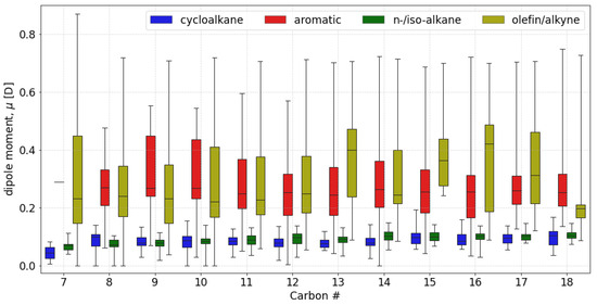 As expected, n-, iso-, and cyclic alkanes all have a much lower mean dipole moment across all carbon numbers compared to unsaturates (aromatics, olefins, and alkynes). Unsaturated compounds also show a much higher variance within carbon number groups, with some species exhibiting lower dipole moments than many alkanes. This makes the identification of carbon-number trends among unsaturated compounds difficult. Alkanes show a slight increase in the dipole moment with higher carbon number, likely due to an increased opportunity for branching.