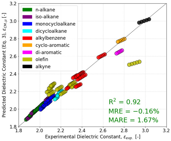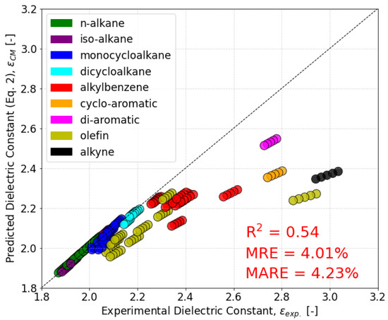 The dielectric constant measurements of 48 neat molecules at five temperatures were compared with values predicted from the Clausius–Mossotti relation (Equation (2)) using the measured density and QSPR-calculated polarizability [14] as inputs. As shown in Figure 2 and Table 1, the majority of n-, iso-, and cycloalkanes in the dataset show good agreement with this equation due to the relatively low dipole moments of most aliphatic hydrocarbons. However, the two additional cycloalkanes measured for this study, 1,3,5-trimethylcyclohexane and cis-1,3-dimethylcyclohexane, show a MARE nearly five times higher than the rest of the alkanes in the dataset and have the two largest dipole moments within the alkanes in the dataset. Since these molecules appear much nearer to the conventional fuel range compared to other alkanes, it is important to ensure that the dielectric constant can be correctly predicted for similar molecules. This is discussed further in Section 3.3. Additionally, for unsaturated molecules exhibiting higher dipole moments, Equation (2) consistently underestimated the dielectric constant leading to a poor overall R2 of 0.54 for the Clausius–Mossotti relation. Given the importance of aromatics for meeting the conventional jet fuel range for the dielectric constant, and the potential impact of certain cycloalkanes as higher-performing substitutes for aromatics in synthetic fuels, Equation (2) alone is not sufficient for accurate predictions.